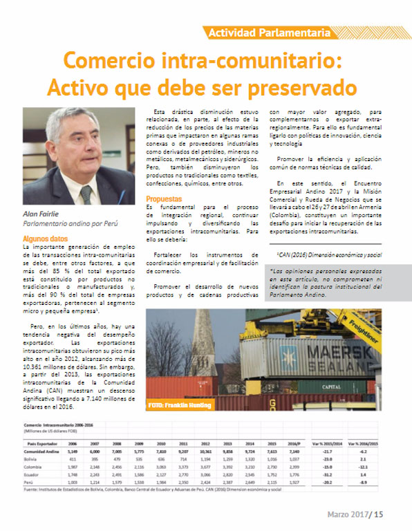 Comparto el artículo que escribí para la revista El Cóndor, del Parlamento Andino. “Comercio intra-comunitario: Activo que debe ser preservado”
