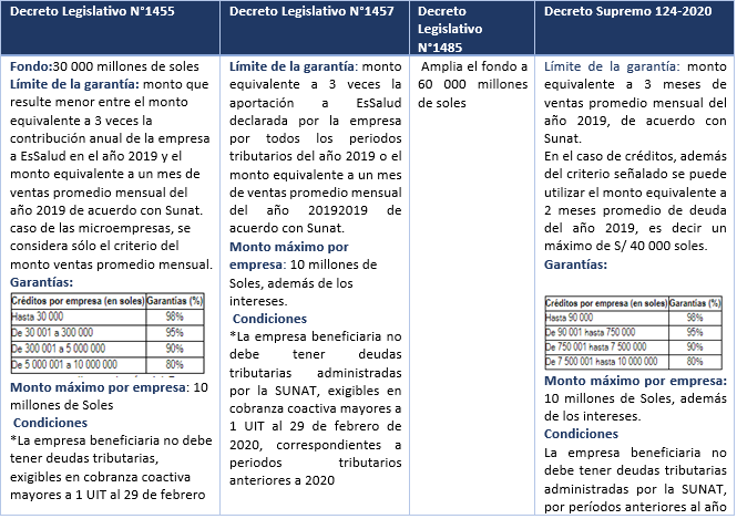 A través del Decreto Legislativo N°1455 se creó el programa “Reactiva Perú”, el cual tiene como fin otorgar financiamiento a las empresas a fin de que estas puedan asumir sus pagos y obligaciones de corto plazo con sus trabajadores y proveedores. Para ello accederán a créditos colocados en las Empresas del Sistema Financiero, los cuales cuentan con la garantía del Gobierno Nacional.
