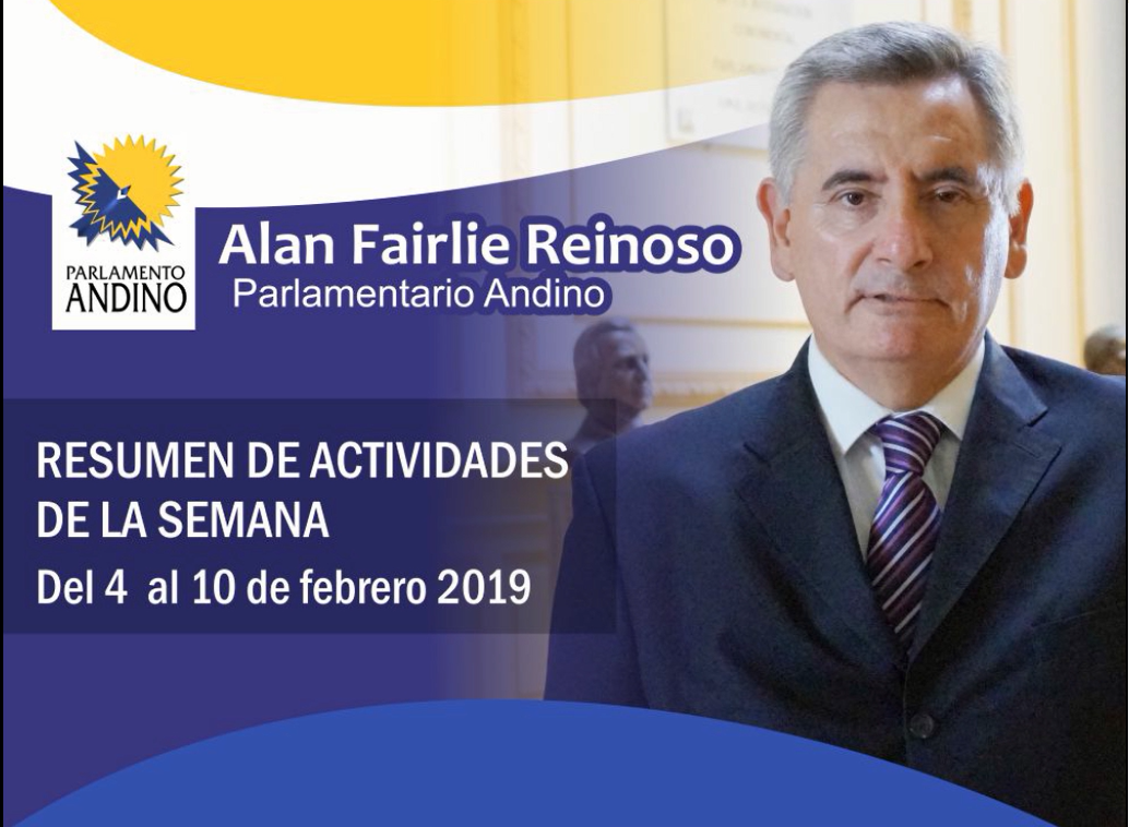 Comparto resumen de actividades desarrolladas en la semana del 4 al 10 de febrero, como parte de mi labor parlamentaria. Actividades realizadas con la finalidad de intercambiar y compartir experiencias con diversos sectores institucionales, académicos y gremiales, dar cuenta del trabajo que vengo desarrollando desde mi despacho del Parlamento Andino, y recoger propuestas e información para elaborar nuevos instrumentos normativos.