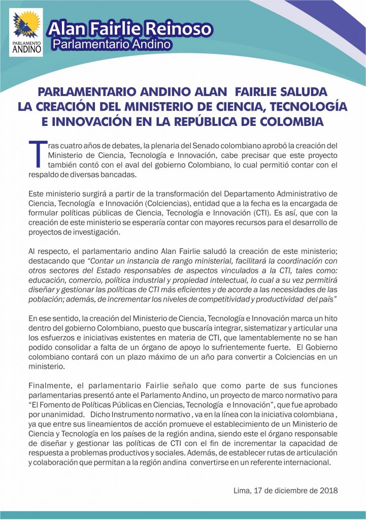 Saludamos al gobierno y al pueblo Colombiano, por la creación del Ministerio de Ciencia Tecnología e Innovación.